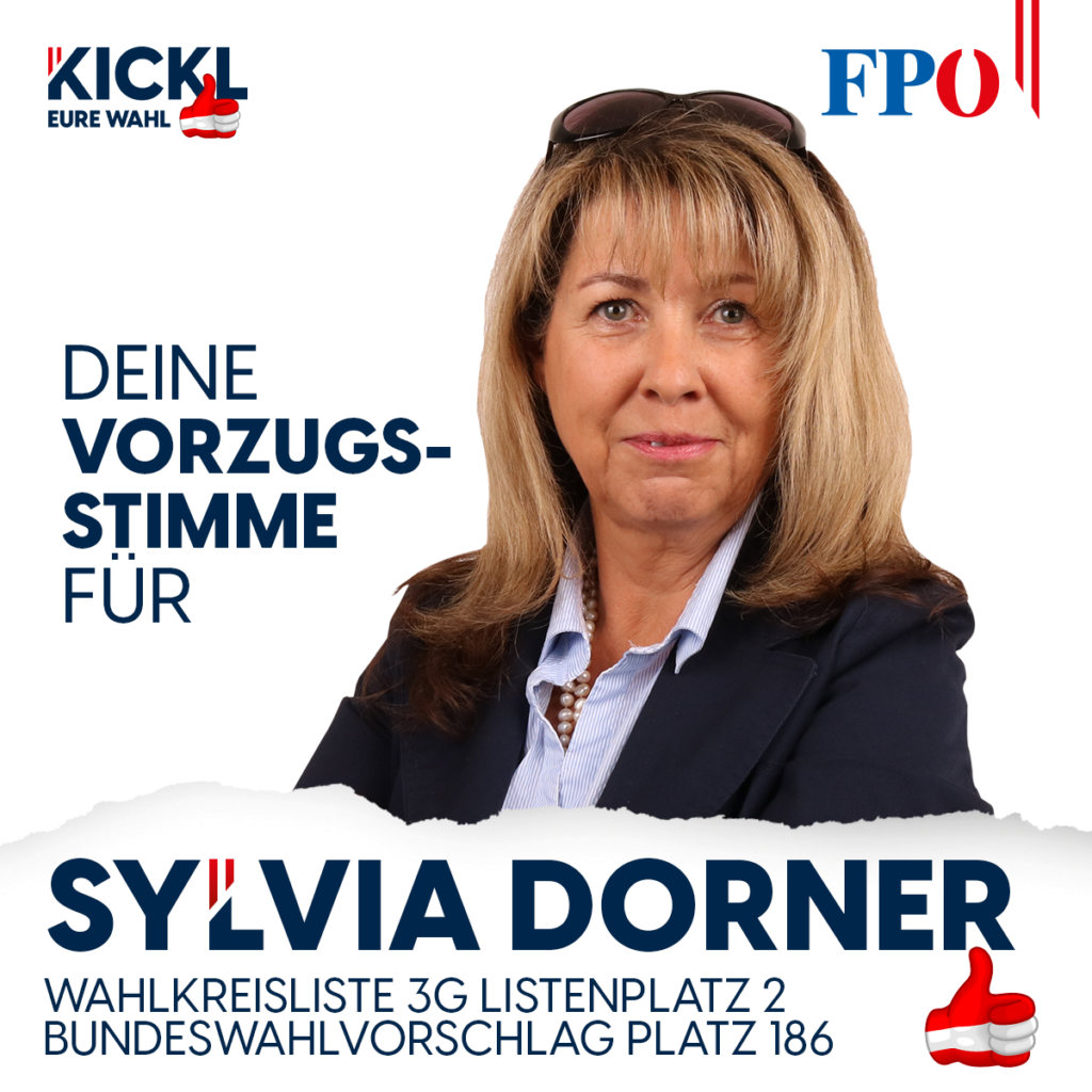 Bundesweit könnt ihr mir eine Vorzugsstimme geben, indem ihr auf dem Bundeswahlvorschlag der FPÖ die Nummer 186 eintragt. Wenn ihr im Wahlkreis 3G NÖ-Ost, das sind die Bezirke Gänserndorf und Bruck an der Leitha, zu Hause seid, könnt ihr zusätzlich auf der Regionalwahlliste bei der Nummer 2 Sylvia Dorner ein Kreuzerl machen.